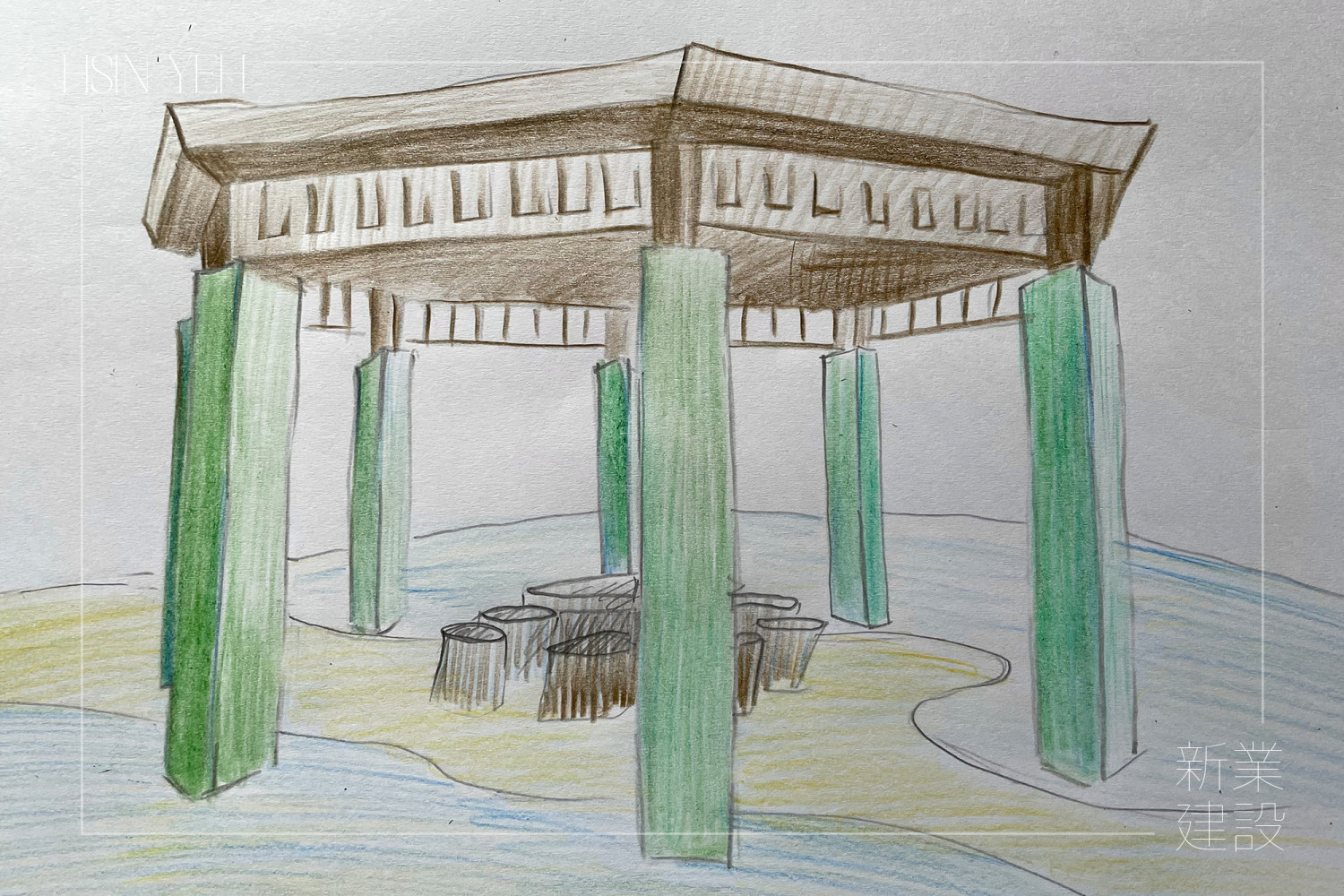 斑駁的地磚、脫落的涼亭磁磚